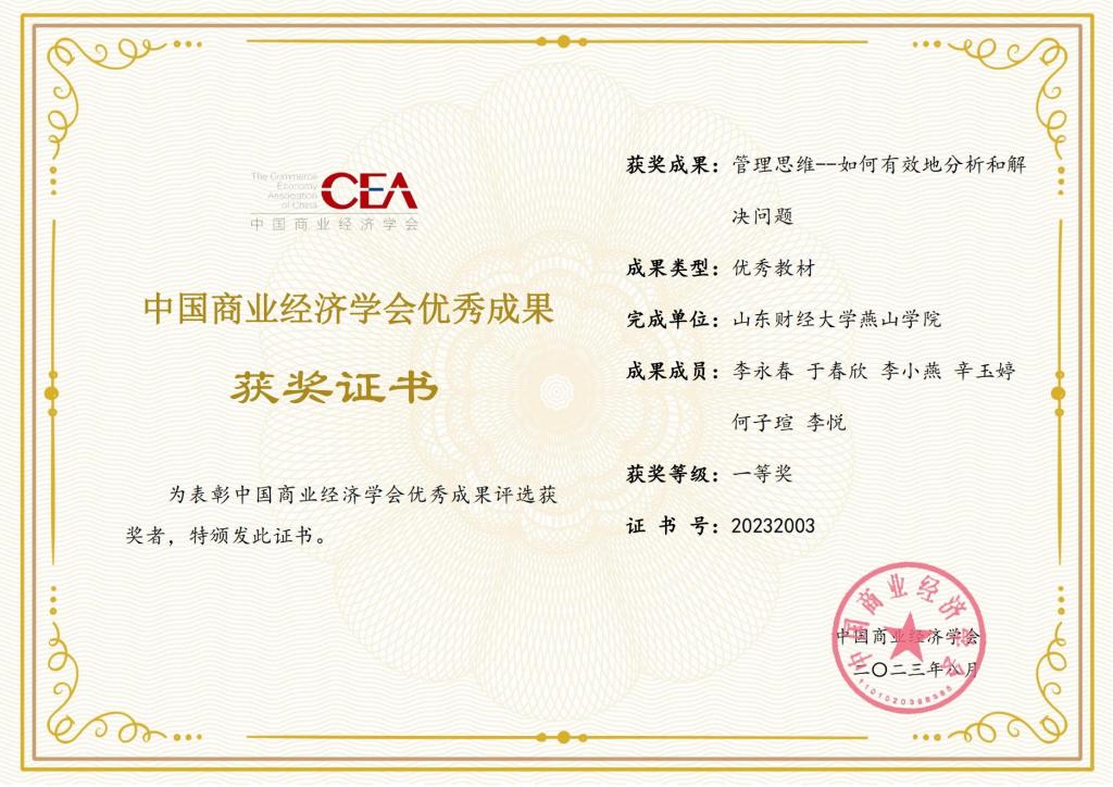 在剛剛結(jié)束的中國商業(yè)經(jīng)濟學(xué)會2023年度優(yōu)秀成果評獎活動中,由6776永利集團院長李永春教授主編的教材《管理思維---如何有效地分析和解決問題》榮獲優(yōu)秀教材一等獎。同時,在8月份進(jìn)行的山東省第十五屆大學(xué)生科技節(jié)活動中,6776永利集團李永春、劉金煒指導(dǎo)的學(xué)生組榮獲山東省大學(xué)生智慧企業(yè)管理創(chuàng)新設(shè)計大賽數(shù)字商業(yè)企業(yè)模擬經(jīng)營對抗賽道一等獎。另外,在前不久公布的山東省教育科學(xué)研究院組織的2023年度山東省教育教學(xué)研究課題...
